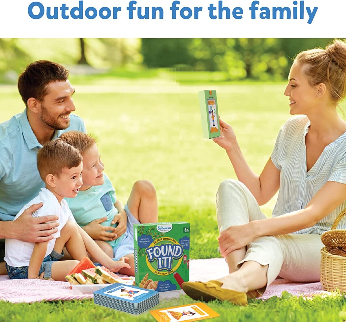 - OUTDOOR SCAVENGER HUNT – Found it! is an exciting outdoor game that helps children learn as they go on the most exciting ‘Search & Find’ with prompts like Can you find…”Something that is heavier than a leaf? Something round?” etc.! Players must shout “FOUND IT!” as soon as they get their hands on the object! The first one to win 7 cards wins the game!